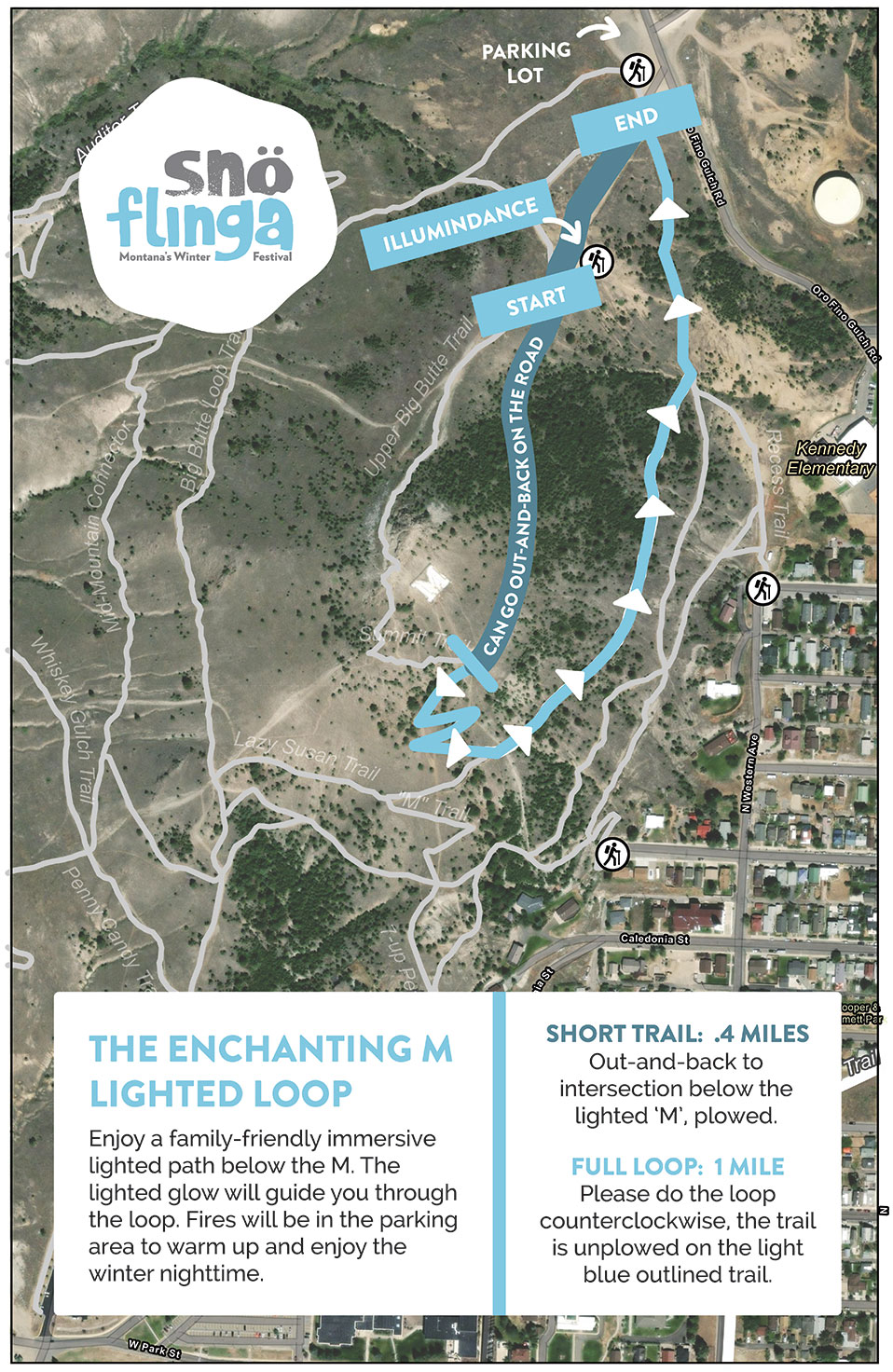 The Enchanting M features a self-guided, illuminated 1-mile loop below the M, open throughout the evening and available to explore at your own pace. Follow the softly glowing path lined with string lights, ice luminaries, and a cozy fire pit at the entrance. Wander, warm up, and take in sweeping views of Butte’s city lights below. The loop will be available for the full event window, and participants are welcome to complete the loop as many times as they’d like (see map below for route details).
